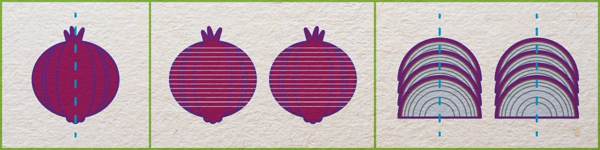(1) Cut onion from top to bottom. (2) Slice each half thinly. (3) Cut the slices in half.