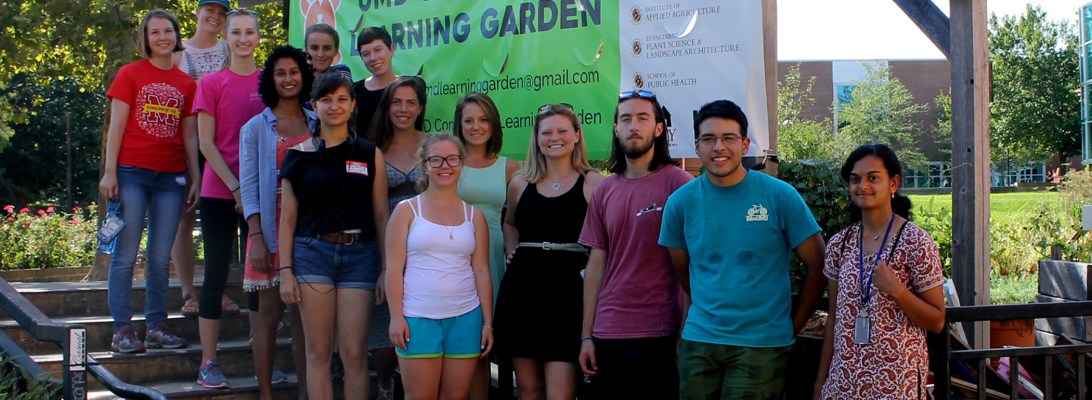 Check out our crew in front of the fancy new UMD Community Learning Garden banner! We are but a few of many burgeoning gardeners who meet at 4 p.m. on Mondays and Thursdays to learn about sustainable food production and help tend the raised beds and terraced plots.