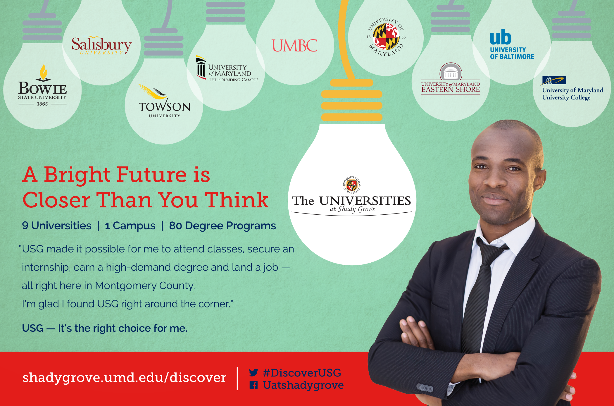 Our Universities at Shady Grove marketing team was the Gold Winner for our “Bright Choice” ad series. For this project, I created the design and layout for the series of six print ads for Bethesda Magazine, which ran from Fall 2014 – Spring 2015.